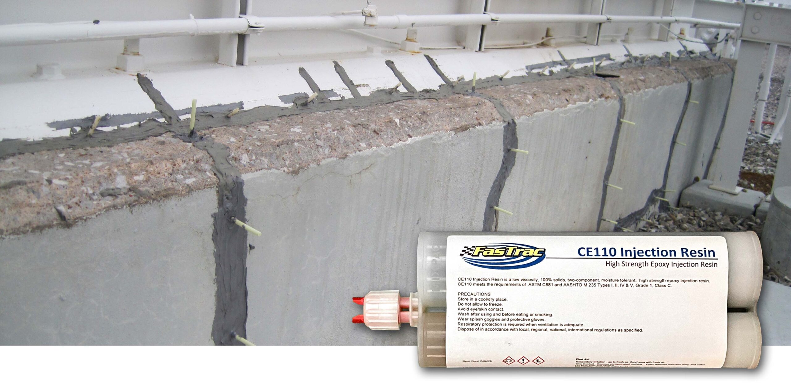 FasTrac CE110 Injection Resin is two-component, 100% solids, moisture-insensitive, ultra-low viscosity, high strength, high modulus, multi-purpose liquid epoxy adhesive. It meets the current ASTM C881 and AASHTO M235 Types I, II, IV & V Grade 1, Classes B & C specifications.